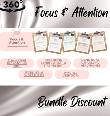 The Focus & Attention Bundle is a 5-part coaching system designed to sharpen your concentration, eliminate distractions, and create sustainable habits for deep, effective work. These worksheets provide practical strategies to help you build focus, protect your attention, and work with clarity and calm.